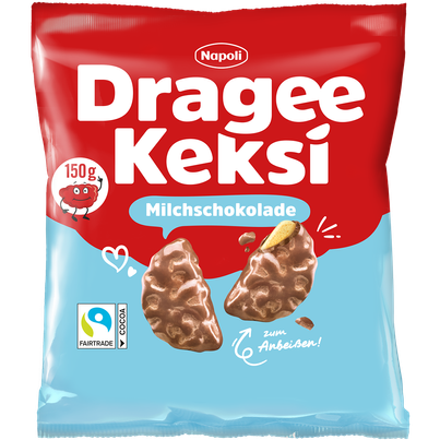 Napoli Dragee Keksi als reine Milchschokoladen-Variante. Die feinen 150 g Milchschokolade Keksis werden wie auch das restliche Keksi-Sortiment mit FAIRTRADE-Kakao hergestellt.